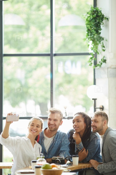 Счастливые оптимистичные молодые мультиэтнические друзья, делающие групповое селфи в современном уютном кафе