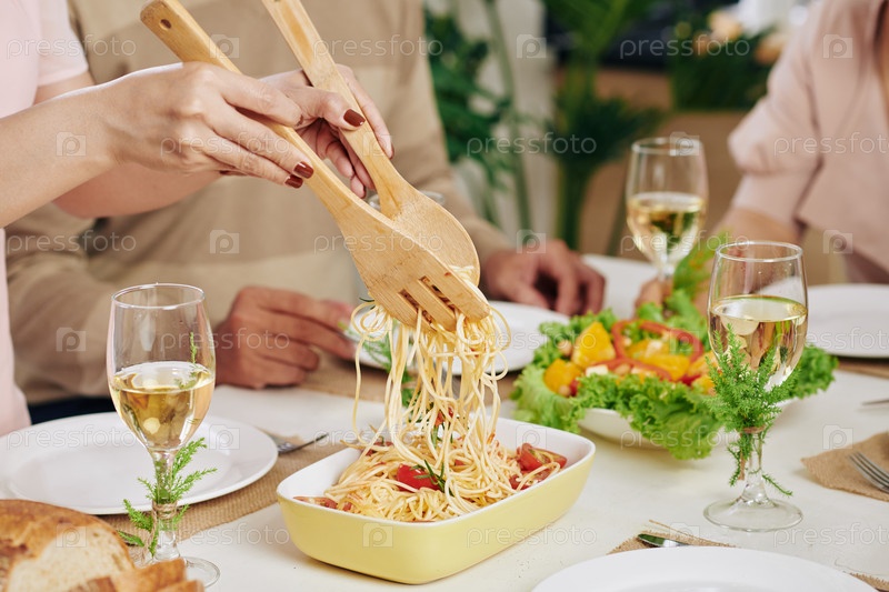Женщина, подающая спагетти на ужин