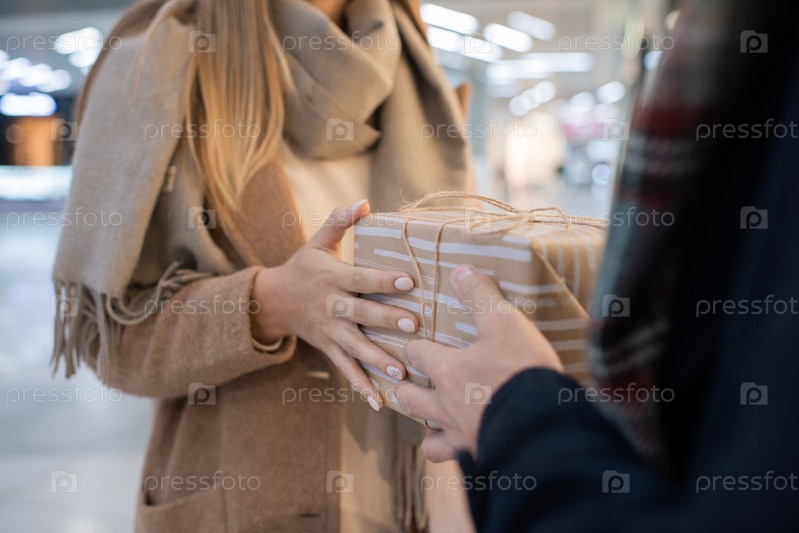 Руки молодой женщины в бежевом шерстяном пальто, берущей подарочный ящик от мужа