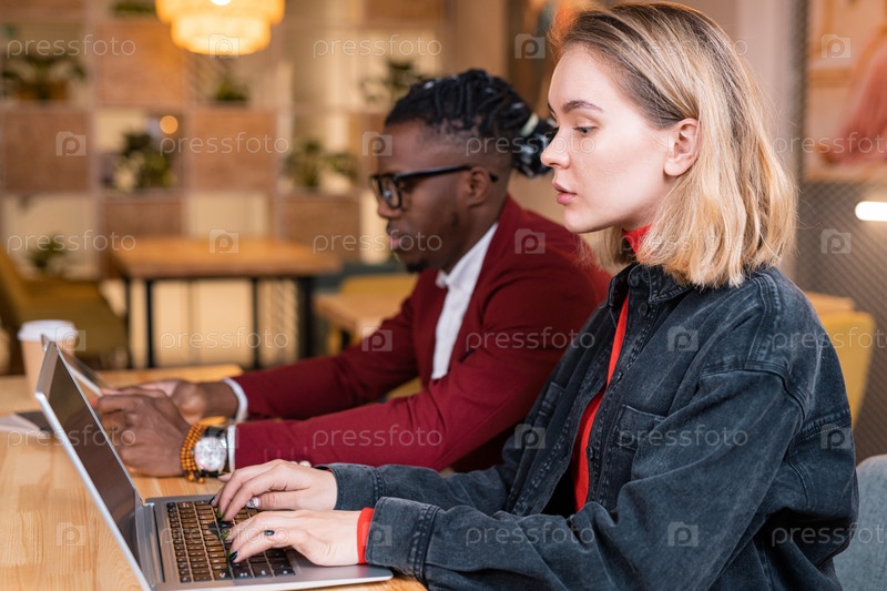 Молодая уверенная в себе сотрудница и ее африканская коллега сидят у ноутбуков