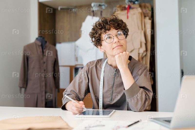 Молодая задумчивая женщина, думающая о новых идеях по рабочему месту