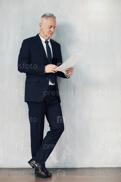 Вдумчивый опытный зрелый бизнесмен в темном формальном костюме, опираясь на стену и анализируя контрактные пункты