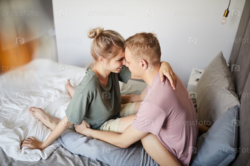 Счастливые молодые супруги в футболках, сидящие на кровати друг перед другом