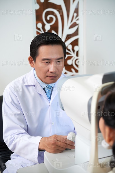 Врач, осматривающий зрение глаза пациента