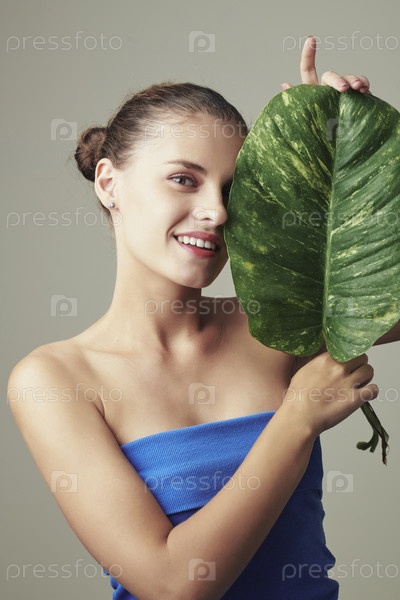 Счастливая женщина позирует с зеленым листом