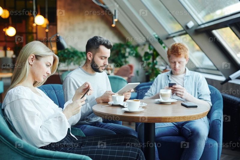 Красивая блондинка и два парня, использующие мобильные гаджеты во время отдыха в кафе
