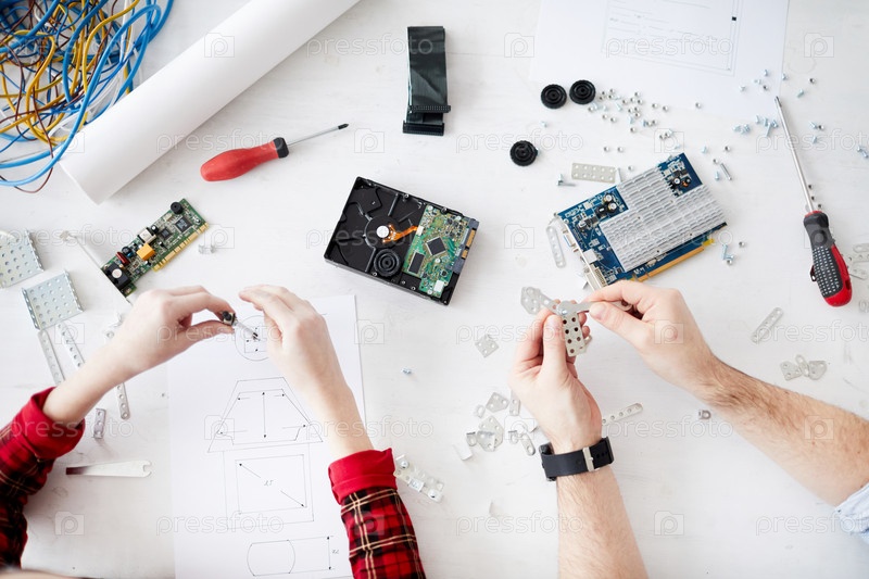 Инженерный класс для детей: высокоугольный взгляд на неузнаваемых мужчину и девушку, собирающих робота с помощью строительного комплекта и эскиза