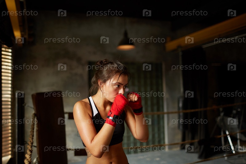 Тяжелая молодая женщина тренируется на ринге бокса