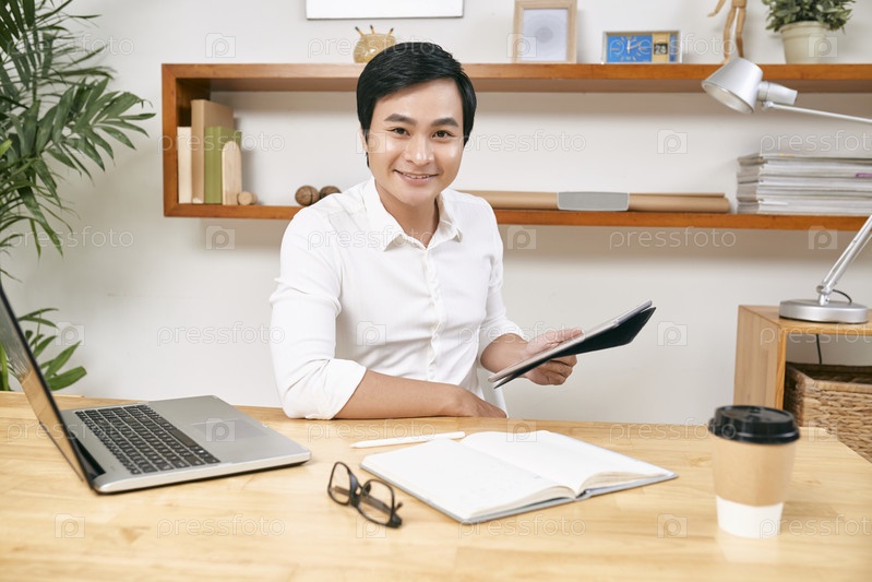 Веселый азиатский бизнесмен за офисным столом
