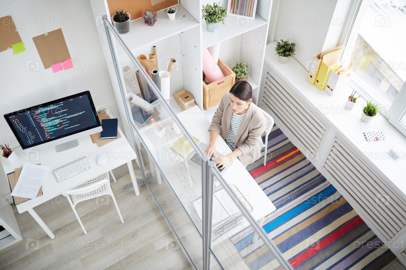 Прямо сверху вид на серьезную сконцентрированную молодую леди-кодер в куртке, сидящую за столом и использующую ноутбук во время написания веб-скрипта в современном офисе