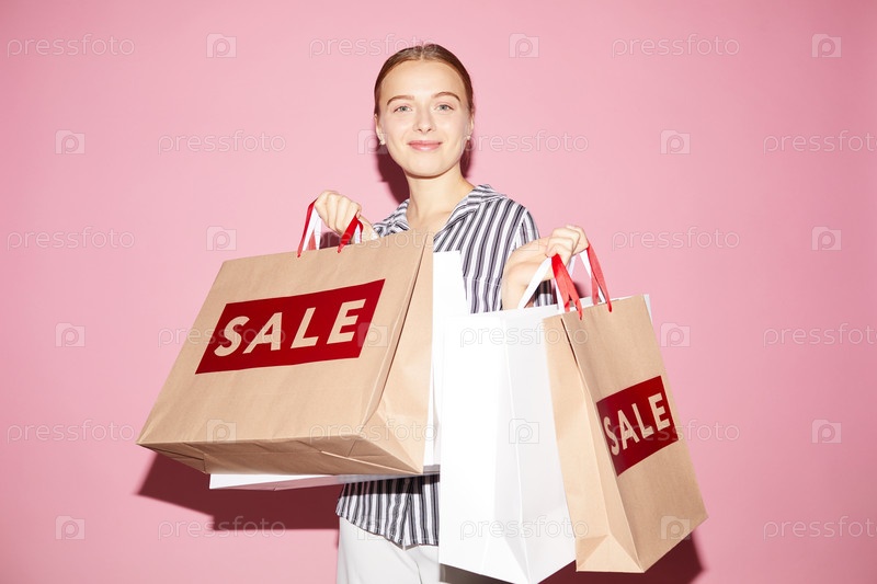 Портрет улыбающейся привлекательной молодой женщины, стоящей на розовой стене и держащей бумажные пакеты во время большой распродажи