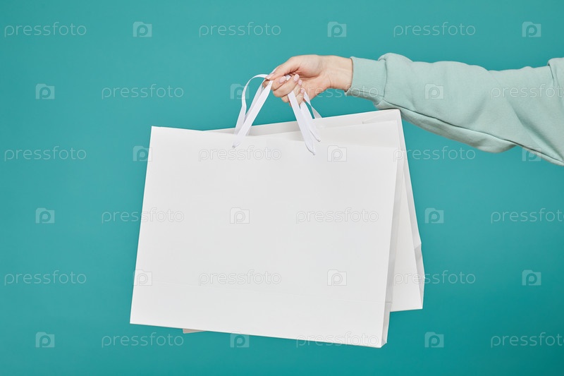 Близкий план неузнаваемой женщины в зеленоватом свитере, держащей белые сумки для покупок на изолированном фоне