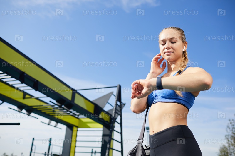 Ниже вид девушки в спортивном бюстгальтере, стоящей на тренировочной площадке и измеряющей пульс с помощью смарт-часов