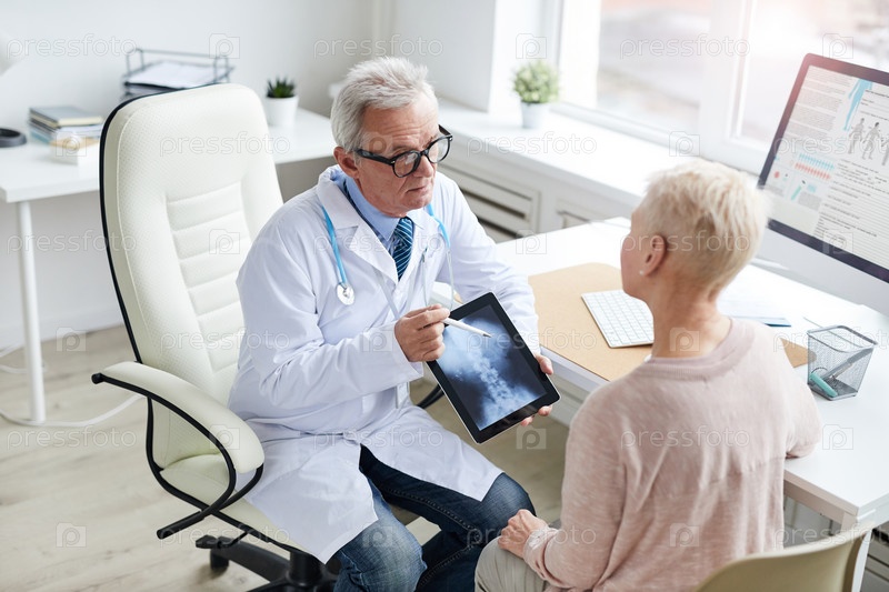 Серьезный пожилой врач в белом пальто сидит за столом и использует планшет, показывая пациенту онлайн рентгеновское изображение позвоночника