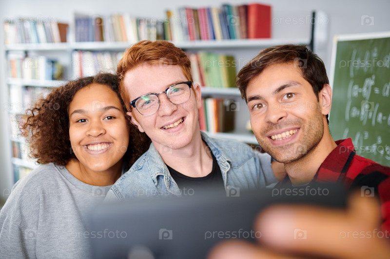 Веселые друзья из колледжа смотрят в камеру, делая селфи