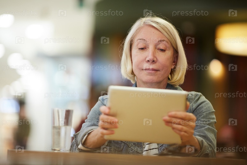 Задумчивая леди смотрит видео на планшете