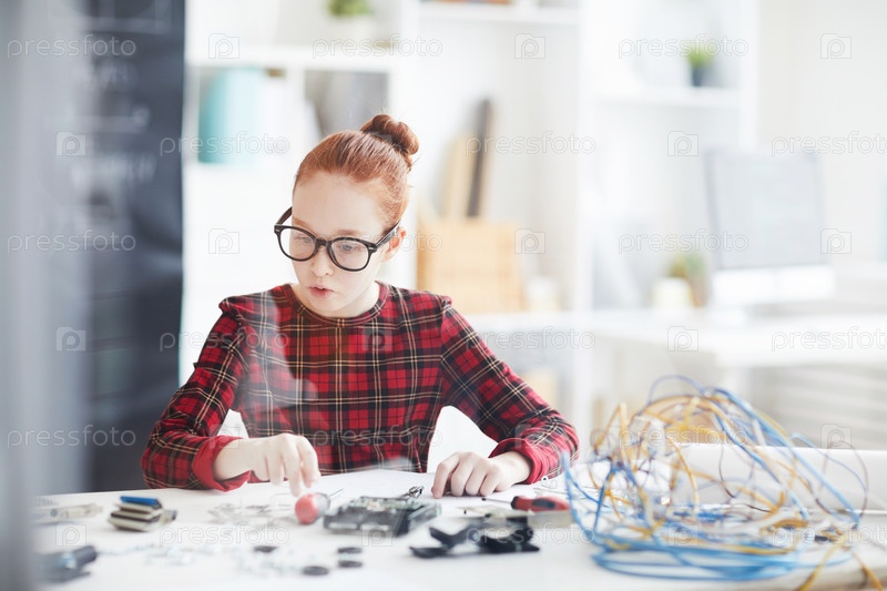 Содержание любопытная умная школьница в очках, одетая в красное квадратное платье сидит за столом и собирает устройство на электронном классе