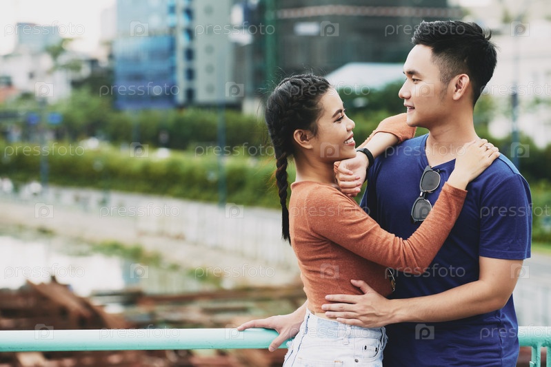 Азиатская пара обнимается на свежем воздухе