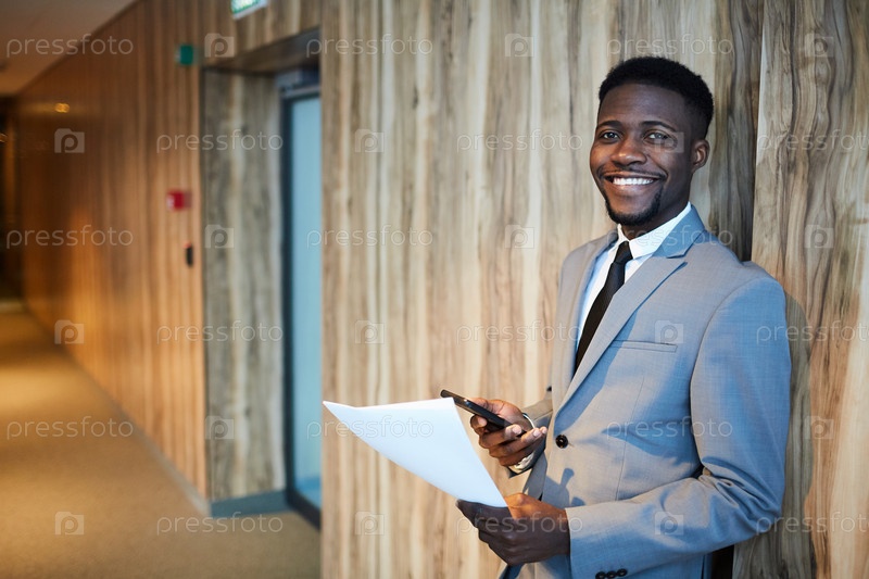 Счастливый этнический бизнесмен с телефоном в коридоре