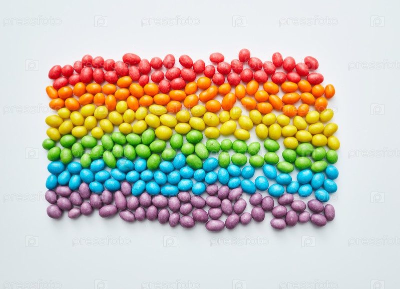 Многоцветные конфеты, расположенные в форме флага равенства на белом фоне, сладкая еда и креативная концепция