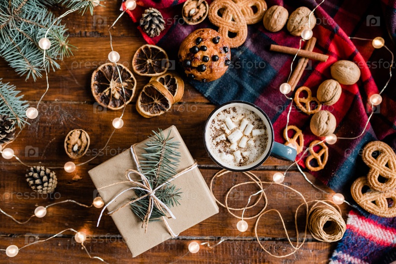 Подарочный ящик, горячий напиток, сосновые шишки, печенье, грецкие орехи, нитки, хвойные деревья и гирлянды