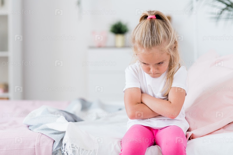 Оскорбленный или скучающий ребенок скрещивает руки на груди, сидя на диване