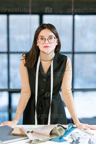 Довольно молодая элегантная швейщица или модный дизайнер смотрят на вас