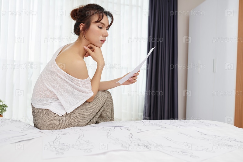 Женщина-дизайнер смотрит на эскиз