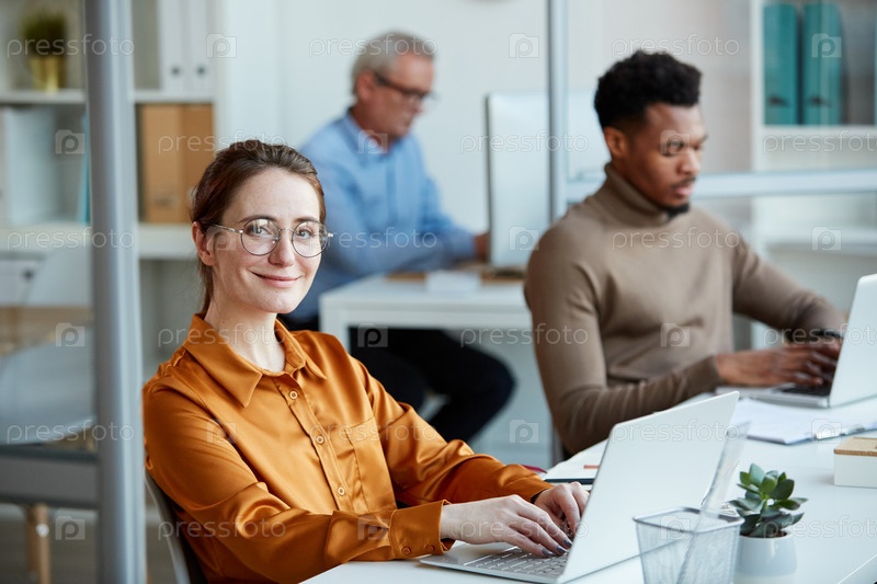Молодая бизнес-женщина печатает на ноутбуке в офисе