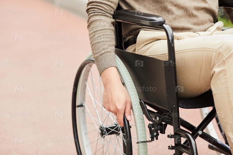 Близкий план неузнаваемого мужчины в повседневной одежде, пользующегося удобной инвалидной коляской во время одинокой прогулки на улице