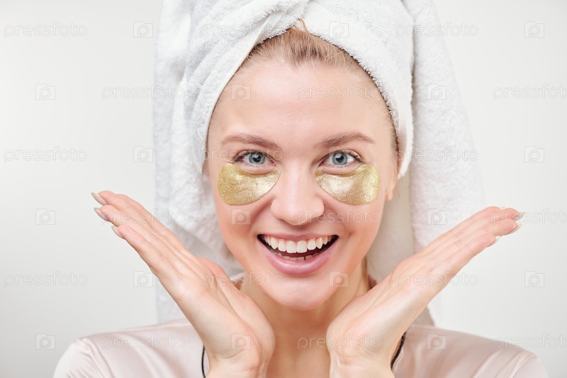 Молодая женщина взволнована возрождающими золотыми пластырями под глазами