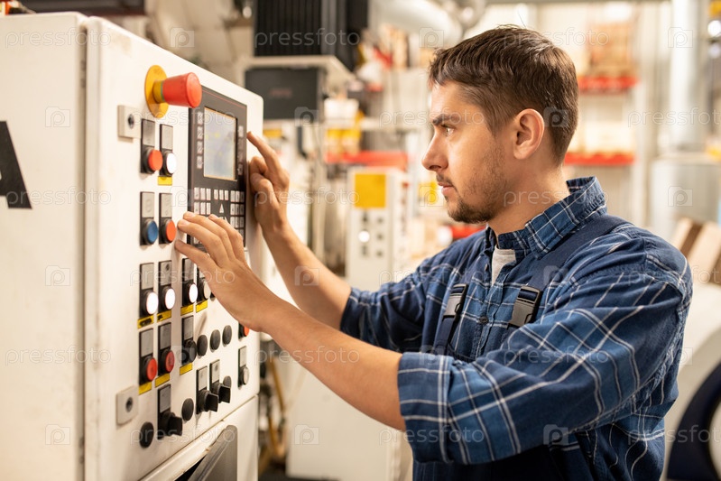 Молодой работник выбирает параметры обработки сырья из термопластичных материалов