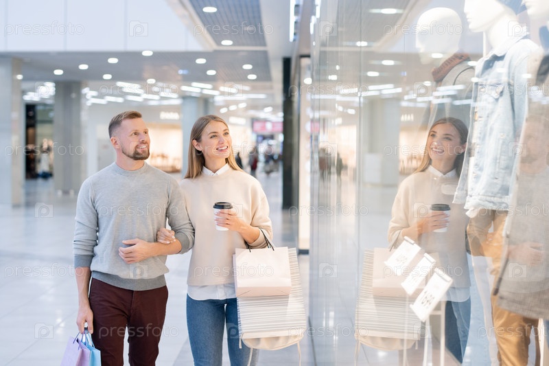 Красивая женщина с напитком и бумажными пакетами, а ее муж проходит мимо витрины