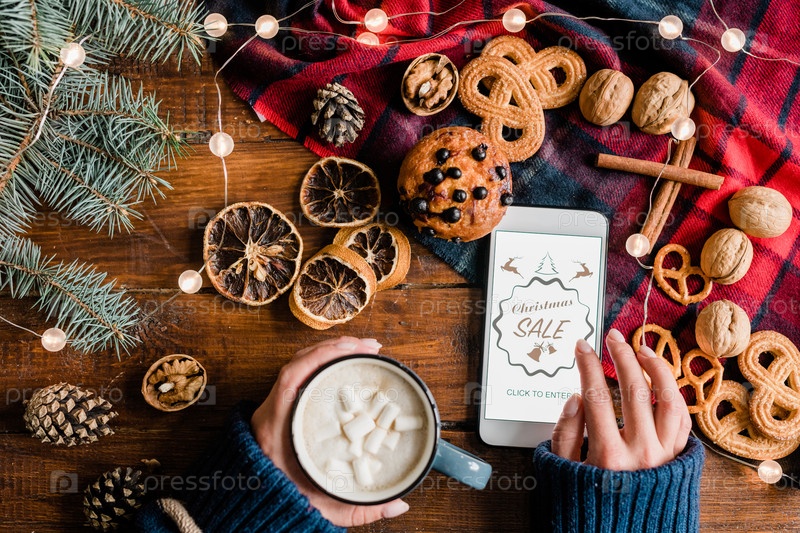 Девушка пьет и прокручивает смартфон, собираясь войти в интернет-магазин