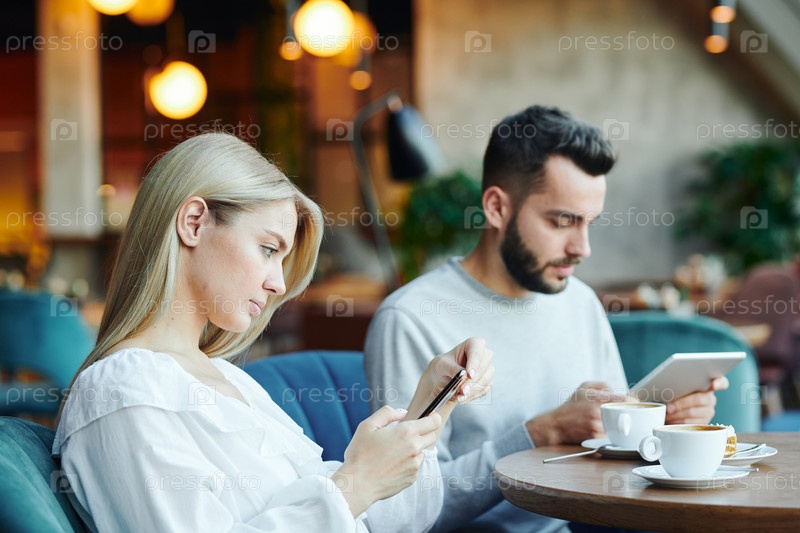 Серьезная блондинка и ее парень, использующие мобильные гаджеты за столом в кафе