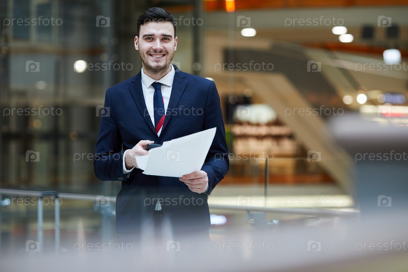 Счастливый красавчик-молодой бизнесмен с плесенью стоит в вестибюле и смотрит на камеру, изучая контракт перед подписанием