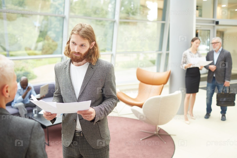 Бородатый бизнесмен разговаривает с коллегой в офисе