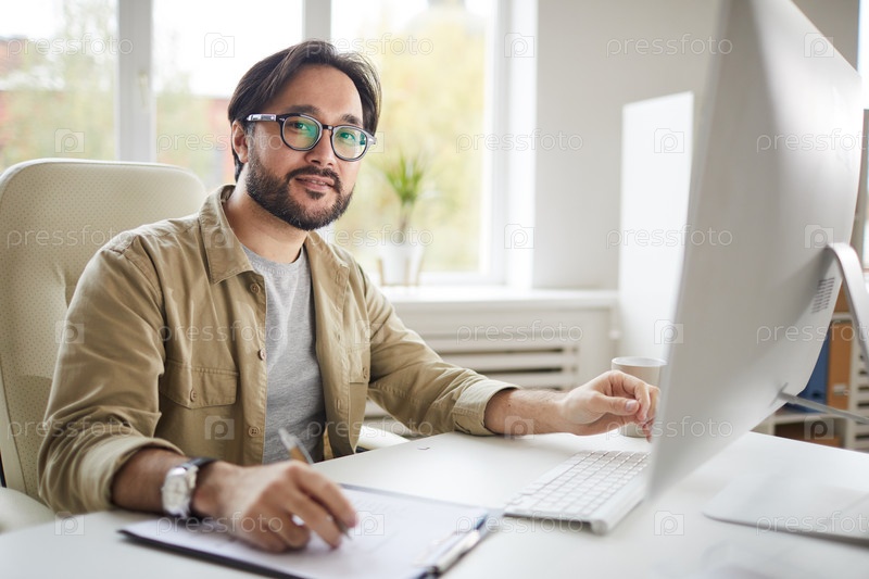 Портрет улыбающегося вдохновленного молодого азиатского дизайнера с бородой, сидящего за столом и использующего компьютер во время записи записей на бумаге