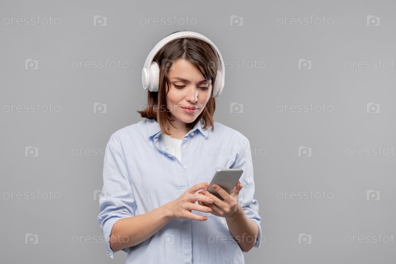 Довольно непринужденная девушка со смартфоном и наушниками, прокручивающая плейлист