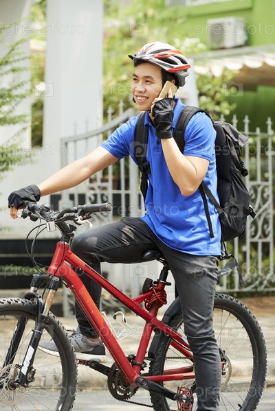 Счастливый доставщик разговаривает по телефону