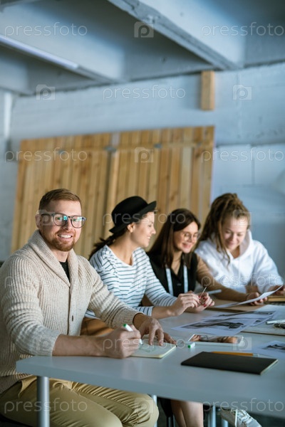 Счастливый молодой модный дизайнер делает эскиз в копие на фоне женщин