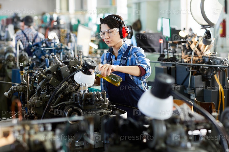 Серьезная женщина-инженер сконцентрировалась на защите ушей и защитных очках, наливая смазку для машины во время работы на фабрике