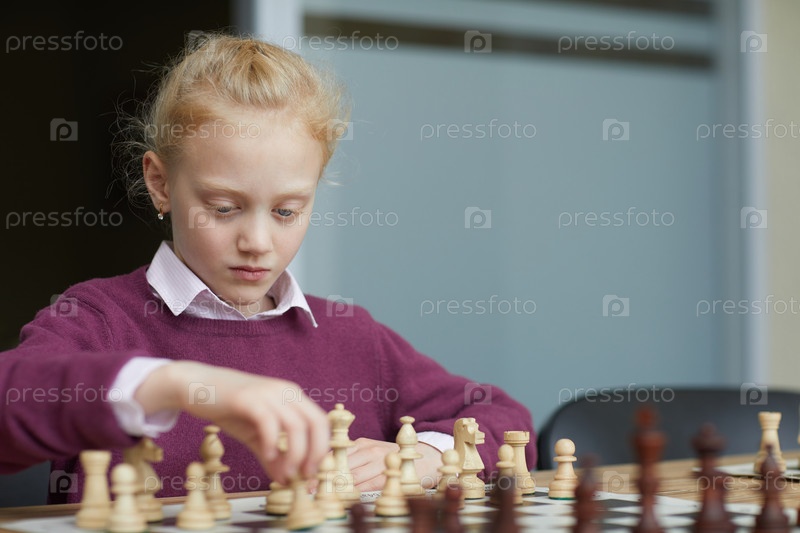 Девушка практикует шахматную стратегию