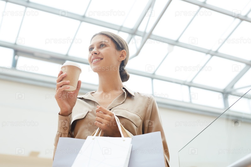 Женщина с кофе и бумажными пакетами