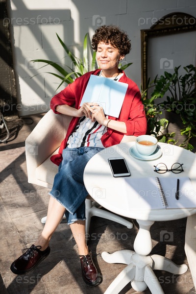 Счастливая молодая мирная женщина с блокнотом, сидящая в кресле возле стола