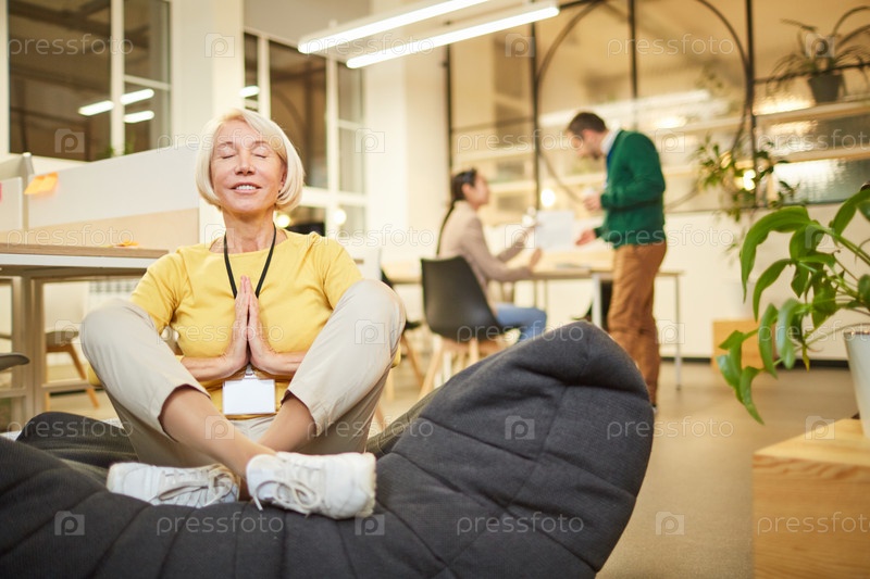 Удовлетворенная женщина, расслабляющаяся йогой на рабочем месте