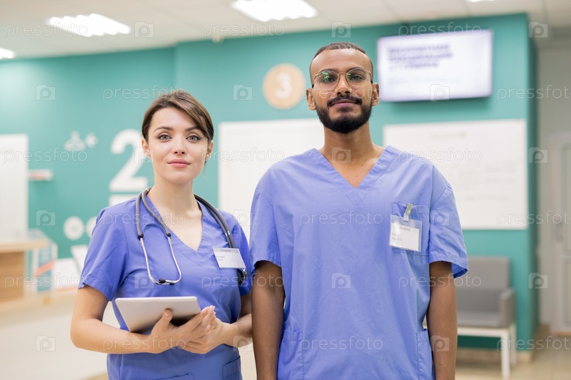 Молодые успешные интеркультурные стажеры в форме стоят перед камерой