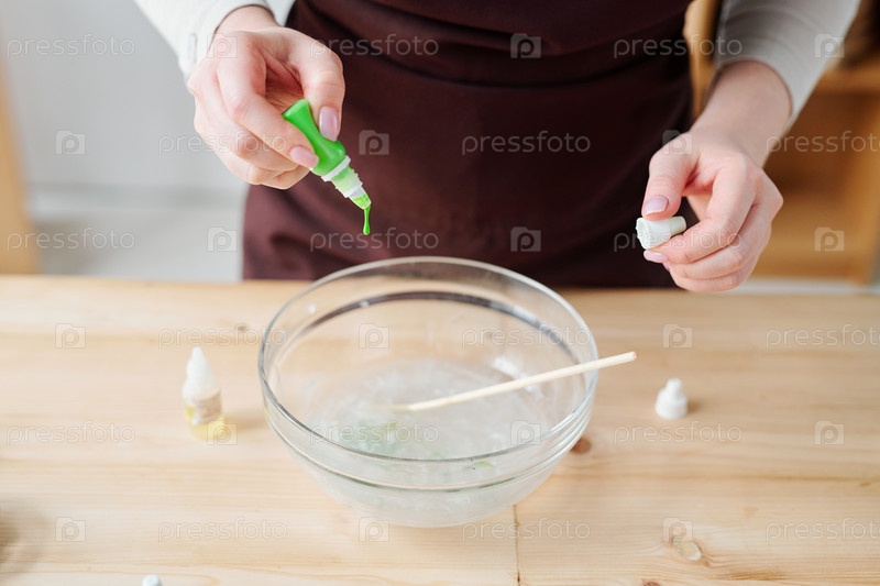 Руки креативной женщины, помещающей зеленый цвет из бутылки в жидкую мыльную массу