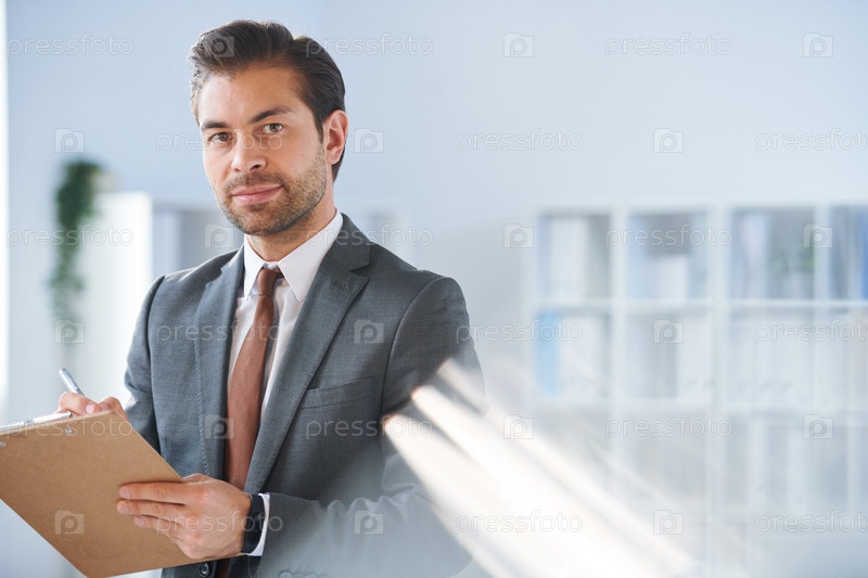 Уверенный предприниматель с накладкой подписывая документ или делая заметки