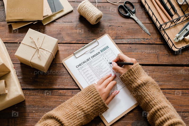 Вид рук молодой женщины, ставшей клещами напротив заказанные предметы в контрольном списке